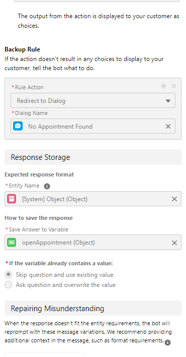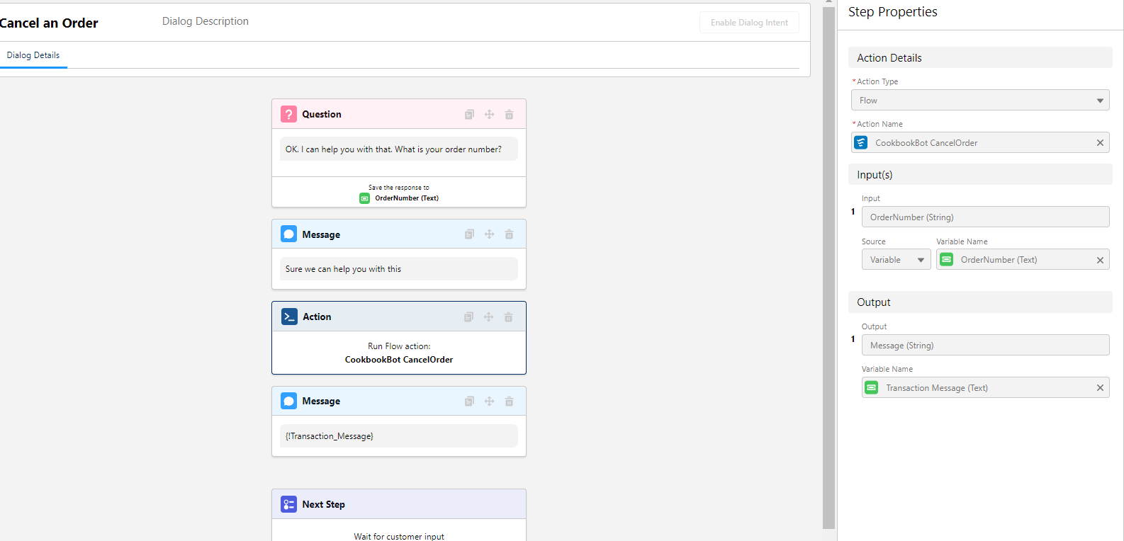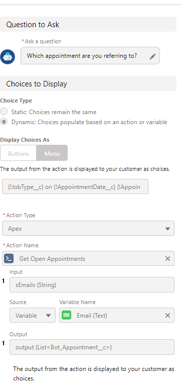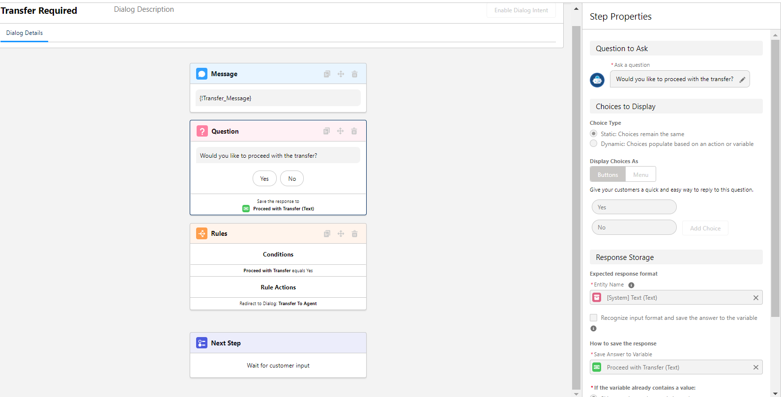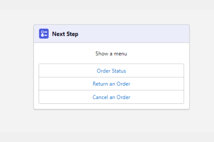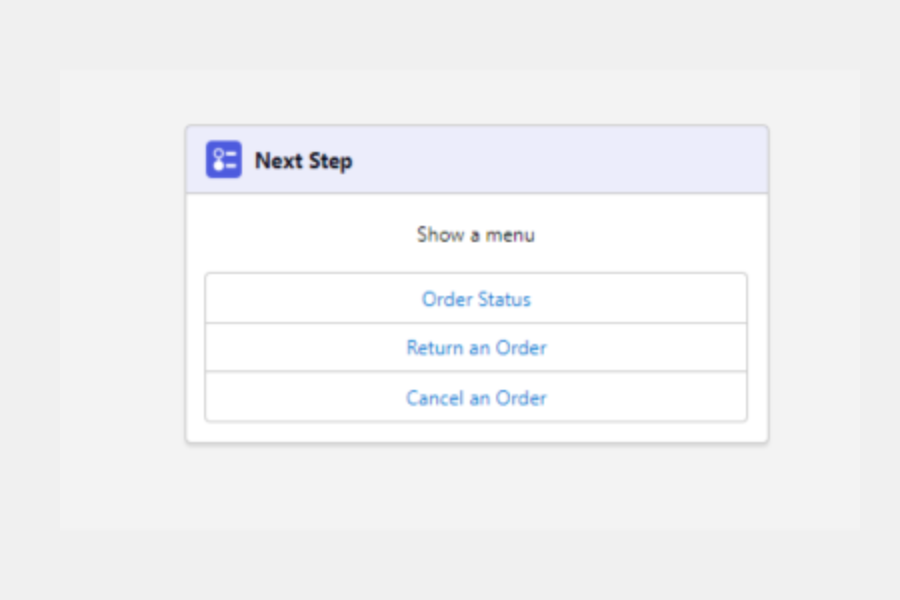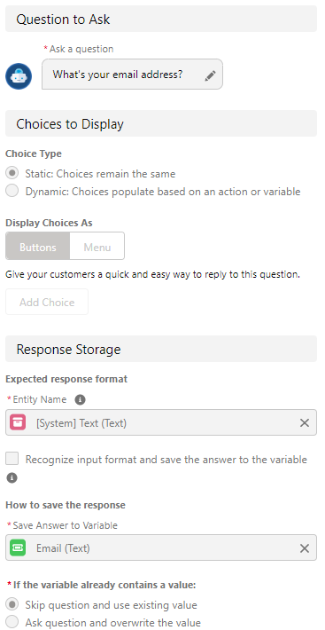 • Question-Gathers information from our customer. Also, Question steps let you present choices for customer responses as buttons or menus.