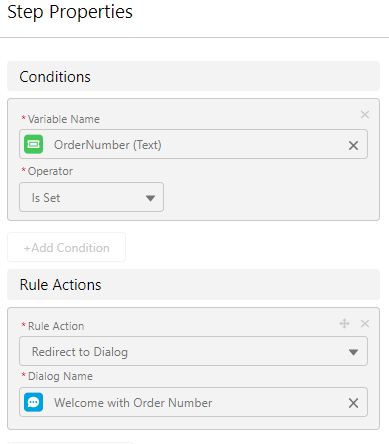 • Rules-Perform specific tasks based on certain conditions. Actions include: call a dialog from within the current dialog, redirect to a different dialog, clear a variable value, transfer to an agent, and set a variable.